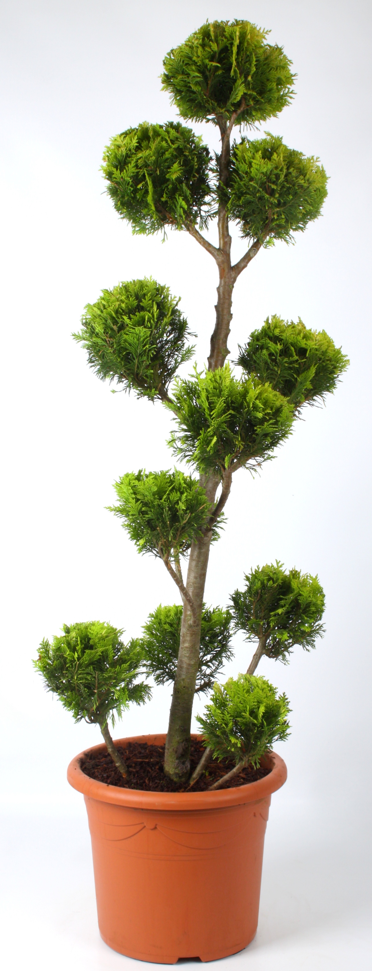 Koniferen-Formschnitt mit hellgrünen Nadeln / Chamacyparis lawsoniana 'Stardust', Scheinzypresse: Dieser Gartenbonsai behält das ganze Jahr die Nadeln und gedeiht sowohl im Halbschatten als auch in der Sonne. Er stammt aus unserer Region, ist deshalb winterhart (bis - 30° C) und absolut robust. Die Pflanze, die verschickt wird, ähnelt der Pflanze im Wuchs und in der Qualität. Die Pflanzenhöhe beträgt 105 bis 115 Zentimeter (130-140 cm inklusive des Topfes).