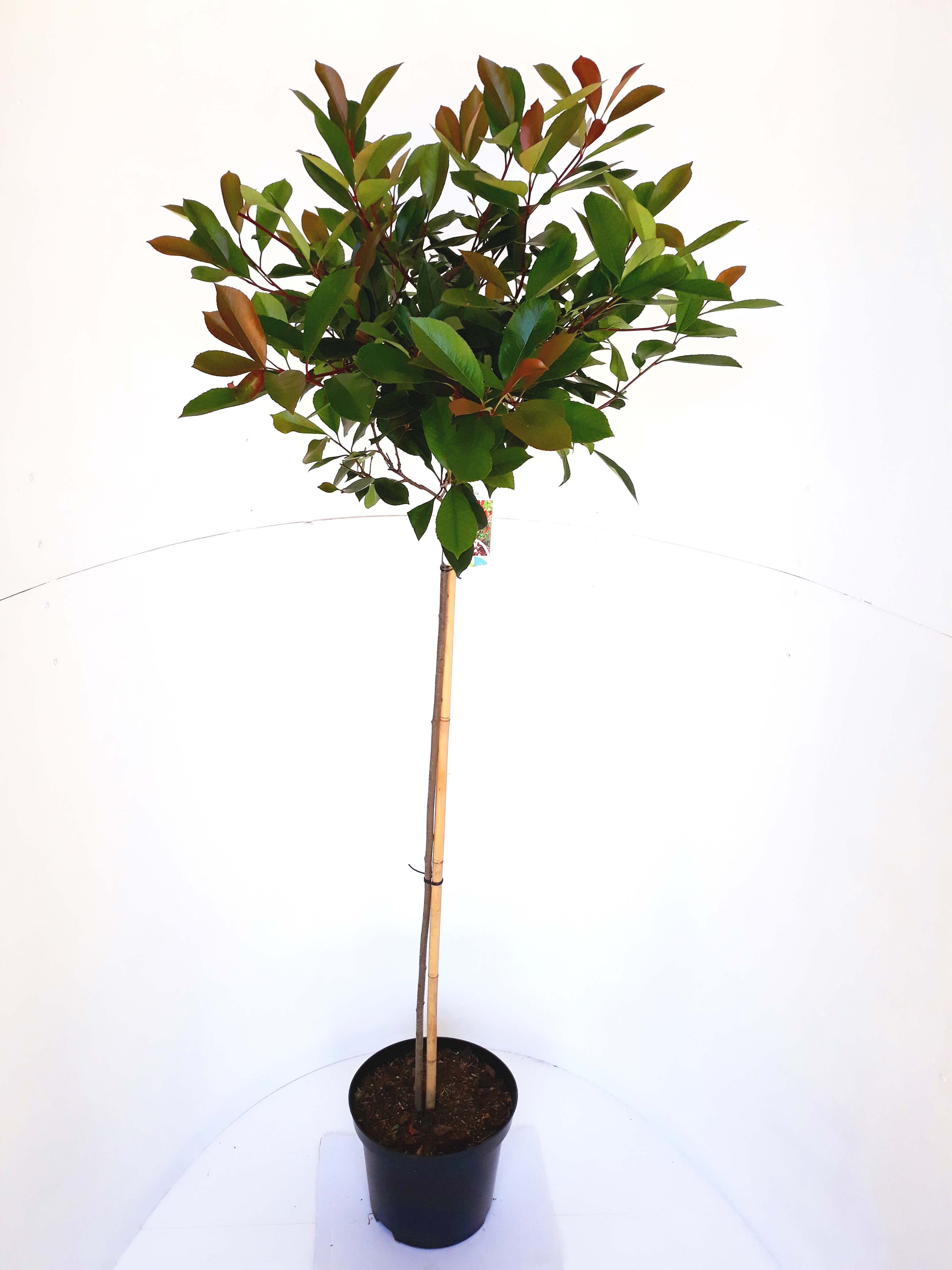Ein Stämmchen mit buschiger und kompakter Krone. Sie ist winterhart und immergrün, auch im Winter. Die Blattfarbe ist im Austrieb leuchtend rot, später wird sie glänzend grün mit rötlicher Färbung. Im Mai bekommt sie weiße Blütenrispen, aus denen dann im Herbst rote Früchte wachsen. Sie passt in jeden Garten, aber auch als Kübelpflanze auf Terrasse, Balkon und vor der Haustür etwas ganz besonderes. Das kleine Bäumchen muntert selbst kleinste Gartenbereiche kontrastreich auf. Derzeit hat das Stämmchen eine Pflanzenhöhe von 100 bis 110 Zentimeter (120 bis 130 Zentimeter inklusive des Topfes und der Krone).